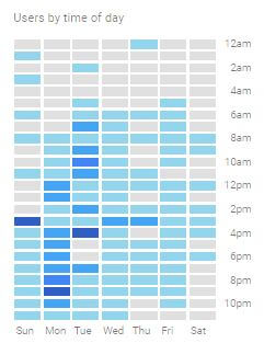 You can also see what times of the day and which days of the week are best for traffic to your site. Have a look at mine: not much happening on a Saturday (the lighter the colour, the less traffic), but Mondays and Tuesdays are great for traffic – again a correlation of when I generally post to social media.